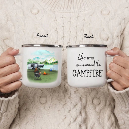 View full detailsPersonalized Camping Enamel Mug/Coffee Mug - 3 Aults With Pet - Best Gift For Camping Lover - Life Is Better Around The Camfire