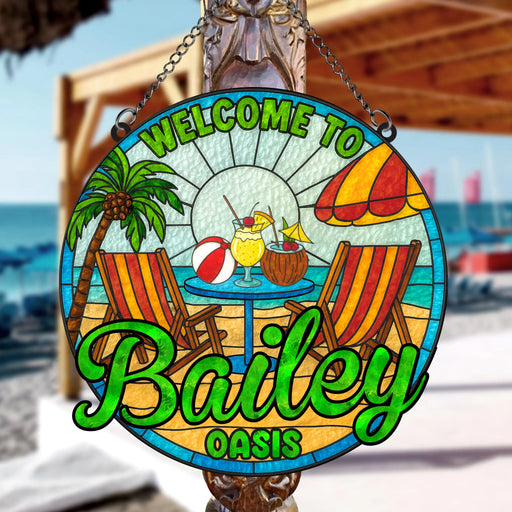 View full detailsPersonalized Tropical Tiki Bar Stained Glass Suncatcher - Summer Gift Idea for Family