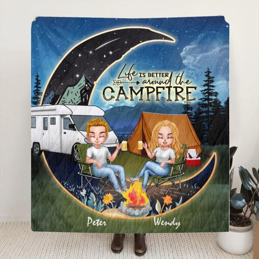 Personalized Autumn Camping Quilt/Fleece Throw Blanket - Couple/Parents With Up to 3 Kids And 4 Pets - Gift For Camping Lovers - Life Is Better Around The Campfire