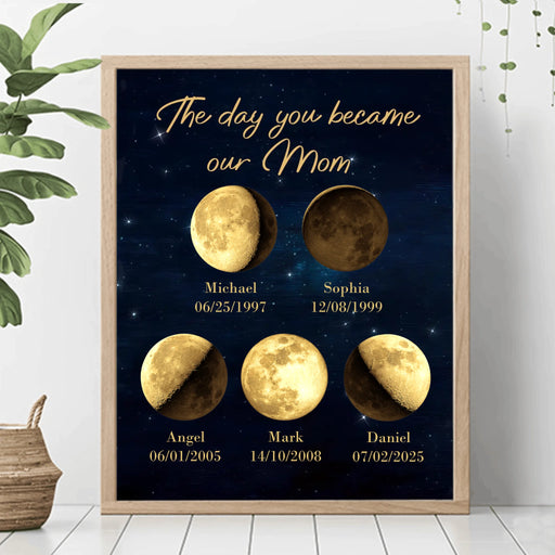 View full detailsPersonalized Moon Phase Poster – The Day You Became Our Mom – Custom Kids’ Birth Dates Moon Art Print – Unique Mother’s Day Gift, Mom Birthday Gift, Family Wall Decor